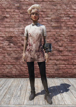 The following are the details. The bloody chef outfit is a white long sleeve shirt with a black bowtie a black pair of pants and a dirty white apron with blood spatters. Craft your own glass of Nuka-Cola a bowl of BlamCo Mac Cheese and more with the recipes in Fallout.